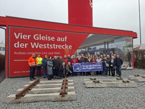 In der Infobox der ÖBB-Infra wurden wir von einem Bauleiter über die Notwendigkeit des 4-spurigen Ausbaus der Weststrecke von Linz nach Wels informiert. Auch hier staunten wir nicht schlecht, was da im Hintergrund dieses Projektes so alles gelaufen ist und auch noch weiter läuft. Wir erfuhren, dass trotz der Startverzögerungen durch diverse Einsprüche der Fertigstellungstermin gehalten werden kann, bzw. muss. 2030 rechnen wir dann mit dem ersten Passagier am "Bahnhof Flughafen Linz", und das Gesamtprojekt "Schiene" wird 2031 abgeschlossen sein. Danach folgen noch die Begleitmaßnahmen wie Begrünung, Radwege und so weiter. Die Schwindelfreien hatten noch die Möglichkeit sich die Trassenführung der neuen viergleisigen Westbahnstrecke von oben anzusehen. Der alte Radarturm, das ehemalige Objekt 8 des Flughafens, konnte gesplittet in 3 Gruppen bestiegen werden. Auch diese Stunde verging wie im Fluge und wir konnten zum dritten, dem gemütlichen Teil übergehen.
